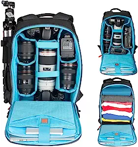 The T&YFOTOP Camera Backpack is the best waterproof camera backpack with a laptop compartment, boasting a dimension of 17.32×13.38×8.27 inches. It features customizable dividers for different cameras, flashes, lenses, and drones, and is compatible with various MacBook models and most laptops up to 16 inches. With its full open design, multiple accessory pockets, hardshell protection,… Read More