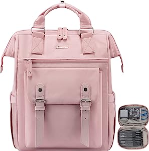 The LOVEVOOK Laptop Backpack is a stylish and functional 17-inch pink white bag with a doctor bag mouth opening and 22 pockets for maximum organization. Its personal item size makes it perfect for travel and it features an external USB port for convenient charging on the go. This fashionable backpack purse is the right size… Read More